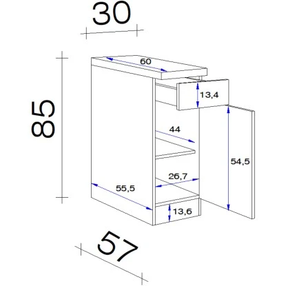 Der 30 cm breite Unterschrank weiß durch eine hochwertige Verarbeitung sowie Materialauswahl zu gefallen und garantiert Ihnen auch auf kleinen Flächen ein Höchstmaß an Stauraum. Dabei verfügt der kompakte Unterschrank neben einer Drehtür auch über einen Schubkasten und einen Einlegeboden.