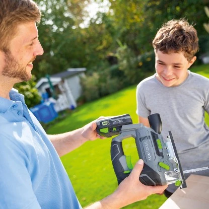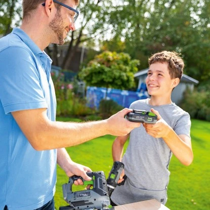 Nützliche Features runden das Set ab: Der Li-Ion-Akku verfügt über eine 4-stufige LED-Anzeige, die Ihnen stets den aktuellen Ladestand angibt. Die Unterseite des Akkus ist gummiert, was für sicheren Grip beim Abstellen der Maschine z.B. auf der Werkbank sorgt. Eine Überhitzungsanzeige bietet zusätzliche Sicherheit. Das Schnellladegerät verfügt über eine Wandhalterung, sodass Sie es nach Belieben griffbereit und platzsparend befestigen können.