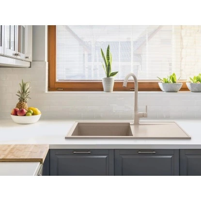 Gefertigt ist die Einbauspüle aus einem widerstandsfähigen Granitverbundstoff in der Farbe Sand. Zu den Materialeigenschaften gehören eine hohe Robustheit sowie Stoßfestigkeit. Gleichzeitig ist es hitzebeständig und pflegeleicht. Es ist wichtig, dass bei der Reinigung von Granitspülen keine chemischen Reinigungsmittel mit ätzenden Eigenschaften, z. B. Chlor, oder Milch mit scharfen abrasiven Bestandteilen zu verwenden. Für die perfekte Pflege und Reinigung der Spüle empfehlen wir den Reiniger und Pflegemittel von Miló, welche separat erhältlich sind.