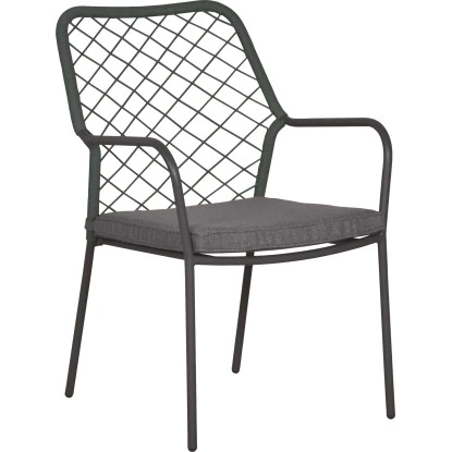Das Stahl-Gestell punktet durch besondere Stabilität und Unverwüstlichkeit. Es lässt sich gut reinigen und ist witterungsbeständig. Die Armlehnen sind zwar schmal, bieten aber durch ihre Rundung eine bequeme Auflagefläche. Ein großes Sitzkissen sorgt für eine weiche Unterlage. Es ist anthrazitfarben und harmoniert mit dem Gestell. Mit einer Dicke von 3,5 cm erhöht das Kissen Ihren Sitz-Komfort. Bei einer Höhe von 85 cm beträgt die Breite 62 cm. Seine Tiefe liegt bei 56 cm.